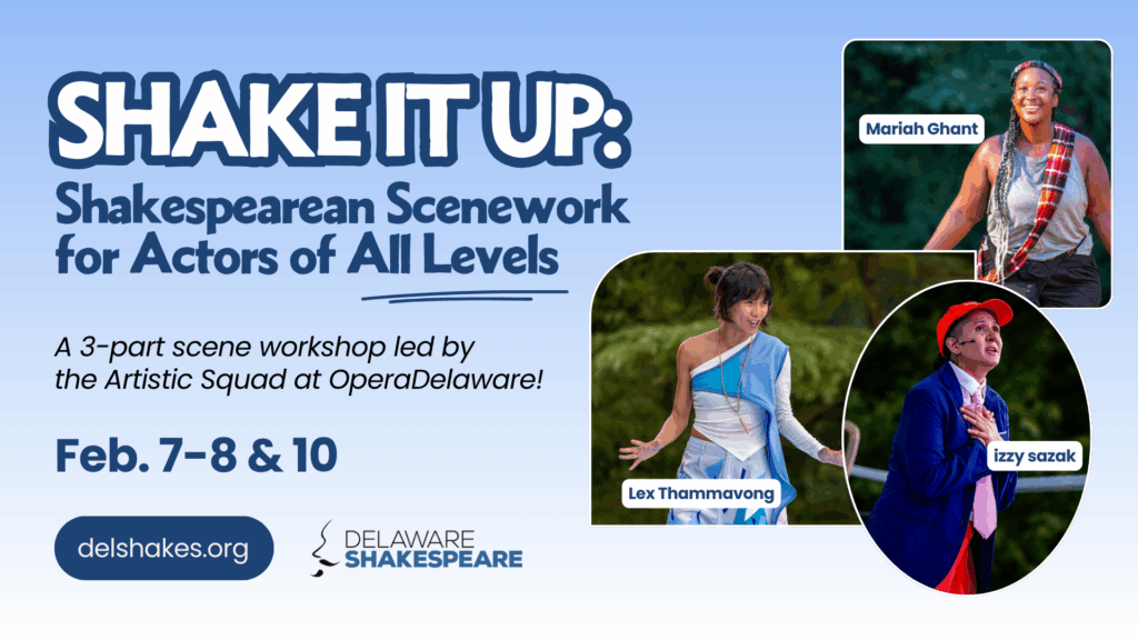Join the Del Shakes Artistic Squad for “Shake It Up: Shakespearean Scenework for Actors of All Levels,” a 3-day workshop at OperaDelaware!
